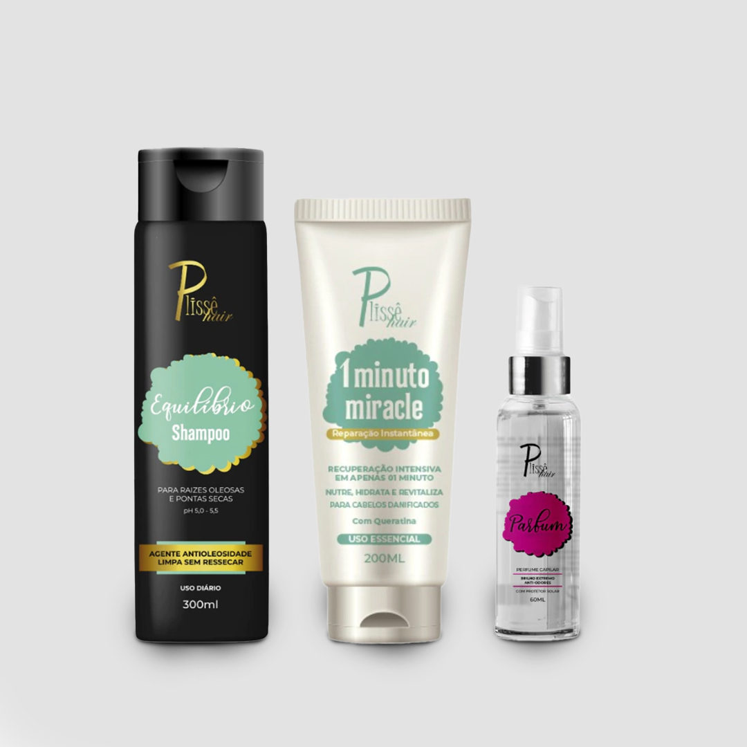 • Shampoo Equilíbrio (300ml): Limpa profundamente sem ressecar os fios, controlando a produção excessiva de óleo e proporcionando uma sensação de frescor e hidratação balanceada.