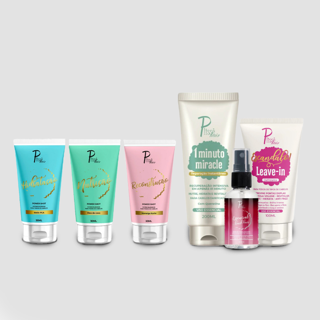 • Power Shot Hidratação (30ml): Com sódio PCA, ajuda a reter a hidratação, melhorando a elasticidade dos fios. Pode ser aplicado puro ou misturado em máscara capilar.